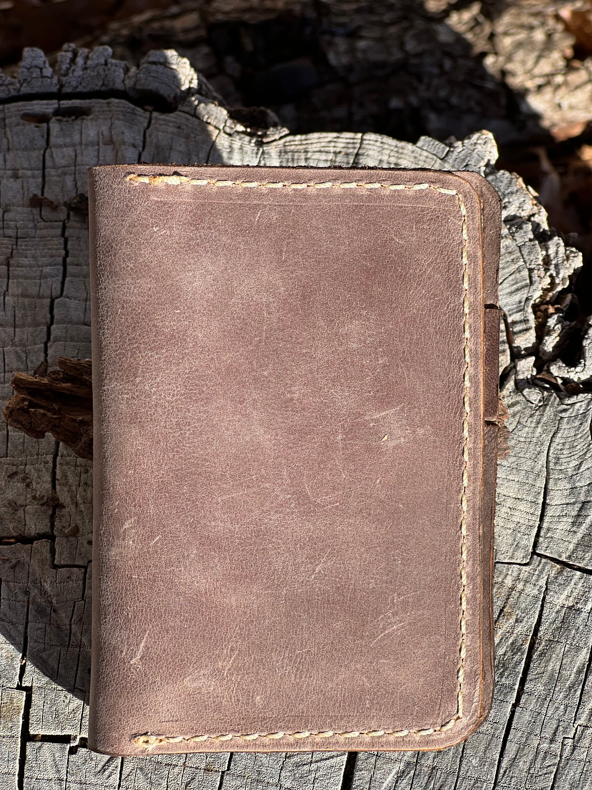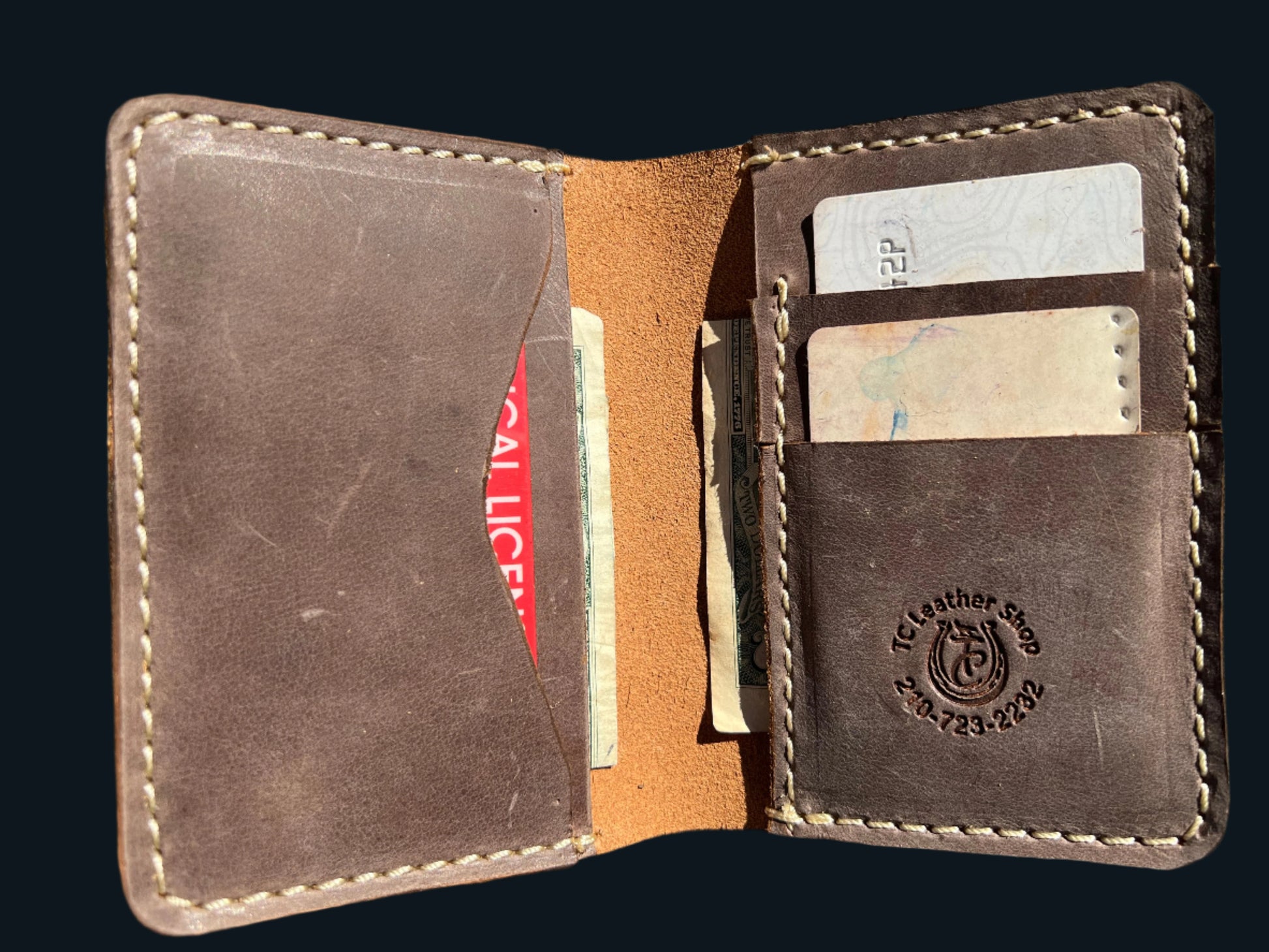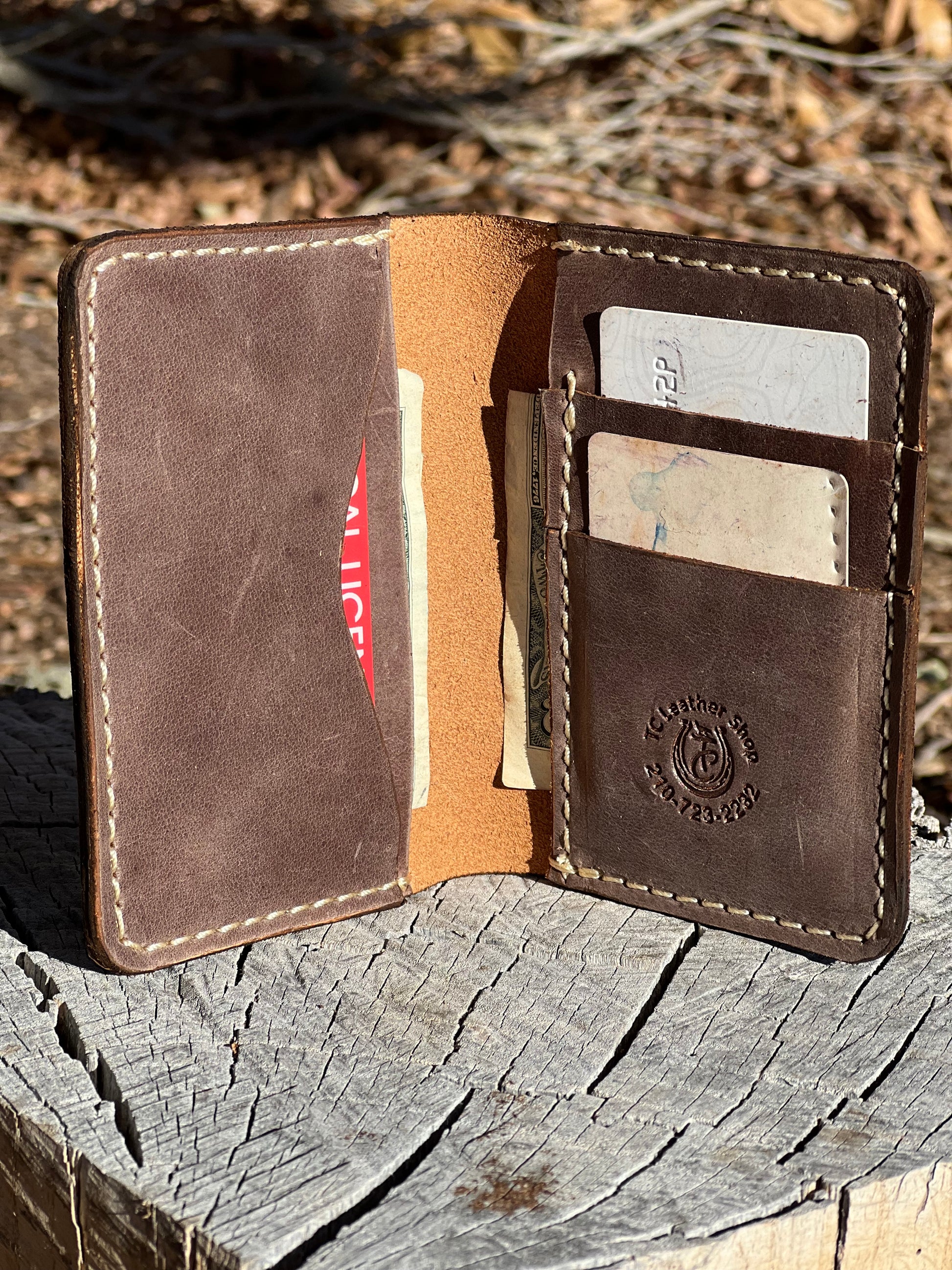 This slim wallet is perfect for your front pocket, business suit, coat, etc. When closed, the wallet measures 5 inches tall and 3 1/2 inches wide. Inside the wallet are two card and three large pockets. Wallet can be made in your choice of leather and colors.