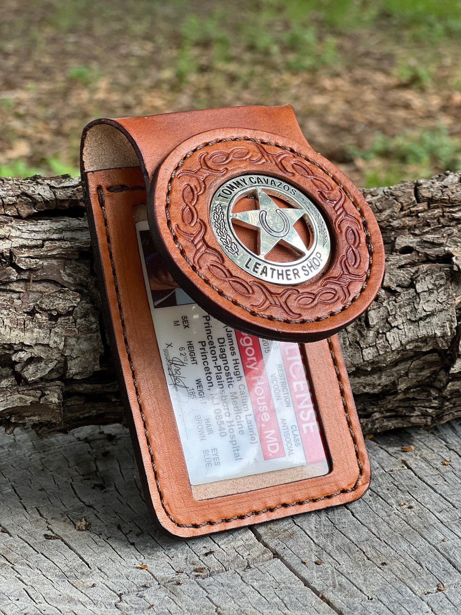 Pricing starts at $45 for plain holder (no stamping, no engraving), $60 for a stamped border (as shown) and $75 for a stamped border and custom backside (such as laser engraving your badge or agency patch).
